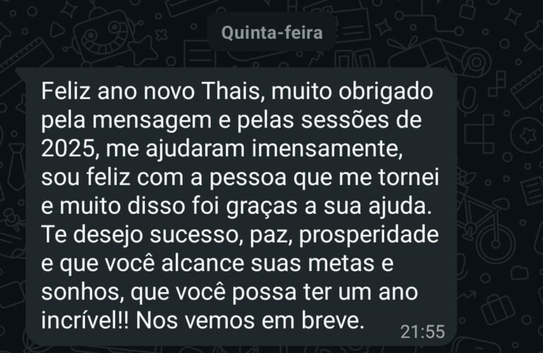 Publicado em A JuliaTrustindex verifica se a fonte original da avaliação é Google. Algumas pessoas fazem toda a diferença na nossa vida, e talvez nem imaginam o quanto. A Thaís é uma dessas pessoas! Tive muita sorte em conhecer o trabalho dela e ser sua paciente. Profissional maravilhosa, ser humano ímpar. Sou muito grata pelo seu trabalho maravilhoso ♥️Publicado em E DriTrustindex verifica se a fonte original da avaliação é Google. A Thais é incrível! Sinto que evolui muito desde que comecei a fazer terapia com ela. Hoje tenho mais clareza sobre as coisas que aconteceram e acontecem graças a ela. As sessões são leves e descontraídas. Ela tem uma sensibilidade muito grande pra te entender e te guiar nesse caminho. Recomendei ela pra todos meus amigos! Todo mundo deveria ter uma Thais na sua vida 🩷Publicado em L GiacominiTrustindex verifica se a fonte original da avaliação é Google. Amo a Thais! Uma profissional extremamente competente, comprometida com a minha melhora e equilibrio! Muito atenciosa, humana e especial. A metodologia do seu trabalho é muito eficaz e garante resultados que eu jamais imaginava! Recomendo fortemente 🙏Publicado em ElaineTrustindex verifica se a fonte original da avaliação é Google. Thais é uma ótima profissional.Publicado em A CarlaTrustindex verifica se a fonte original da avaliação é Google. Thais é uma profissional incrível, qualificada,consegue ter um entendimento de cada paciente de forma única com muito profissionalismo e acolhimento de cada história individual.Publicado em J correaTrustindex verifica se a fonte original da avaliação é Google. Thais é uma excelente profissional! Sempre muito atenciosa e acolhedora. Me sinto super seguro e confortável para conversar. Recomendo para quem busca apoio psicológico de qualidade.Publicado em S GuerraTrustindex verifica se a fonte original da avaliação é Google. Thais é uma profissional muito capacitada. É estudiosa e muito preparada. Sempre atenta aos detalhes e é muito acolhedora no contato. Eu recomendo de olhos fechados.Publicado em B DantasTrustindex verifica se a fonte original da avaliação é Google. Uma excelente profissional! me ajudou muito a ver novos horizonte e a me entender melhor. Tanto que minhas relações pessoais e profissionais melhoraram muito depois da sessões com a doutora Thais! Um trabalho excepcional, mais do que indicado!Publicado em G nejrTrustindex verifica se a fonte original da avaliação é Google. Me senti extremamente confortável durante as consultas!Publicado em L DanielTrustindex verifica se a fonte original da avaliação é Google. Muito bom o atendimento, me senti acolhido e foi reconfortante falar com a Dra. Thais sobre minhas questões. Virei cliente fiel, super recomendo. Muito obrigado Thais por me ajudar no meu momento de fragilidade.Carregue maisCertificado: TrustindexO selo verificado do Trustindex é o Símbolo Universal de Confiança. Apenas as melhores empresas podem obter o selo verificado que tem uma pontuação de avaliação acima de 4.5, com base nas avaliações dos clientes nos últimos 12 meses. Leia mais